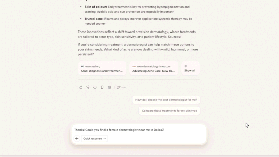 - Health: Copilot provides evidence-based answers from sources like Harvard Health and helps locate doctors by specialty, location, or language preference.