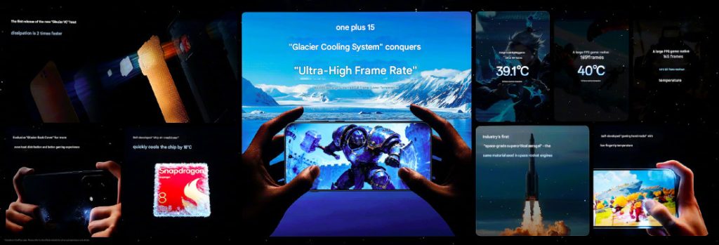 The OnePlus 15 is powered by the flagship Snapdragon 8 Elite Gen 5 SoC with up to 16GB LPDDR5X RAM and uses all-new Glacier Cooling System which is industry’s first ultra-thin “hand-tearable steel” material increases vapor liquid cooling space by 43% and increases capillary water absorption by 100%. It uses industry’s first aerospace-grade “supercritical aerogel” with the insulation material derived from the same source as space rocket engines, keeps fingertips cooler.