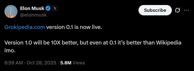 Musk announced the rollout on X, stating that Grokipedia is “better than Wikipedia even at 0.1,” and added that Version 1.0 will be ten times better. The initial release includes about 885,279 articles, generated using xAI’s large-scale computing resources.