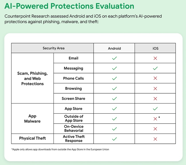 According to a Counterpoint Research evaluation, Android smartphones offer the broadest AI-powered protection, covering ten key areas such as email filtering, browsing safety, and behavioral detection. In contrast, iOS devices were found to use AI in only two protection categories.