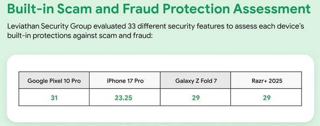 A separate assessment by Leviathan Security Group compared scam and fraud protection on the iPhone 17, Pixel 10 Pro, Moto Razr+ 2025, and Samsung Galaxy Z Fold 7. The study concluded that Android devices, led by the Pixel 10 Pro, provide the strongest default scam and fraud defense.