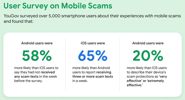 - Pixel users were 96% more likely than iPhone owners to report zero scam texts.