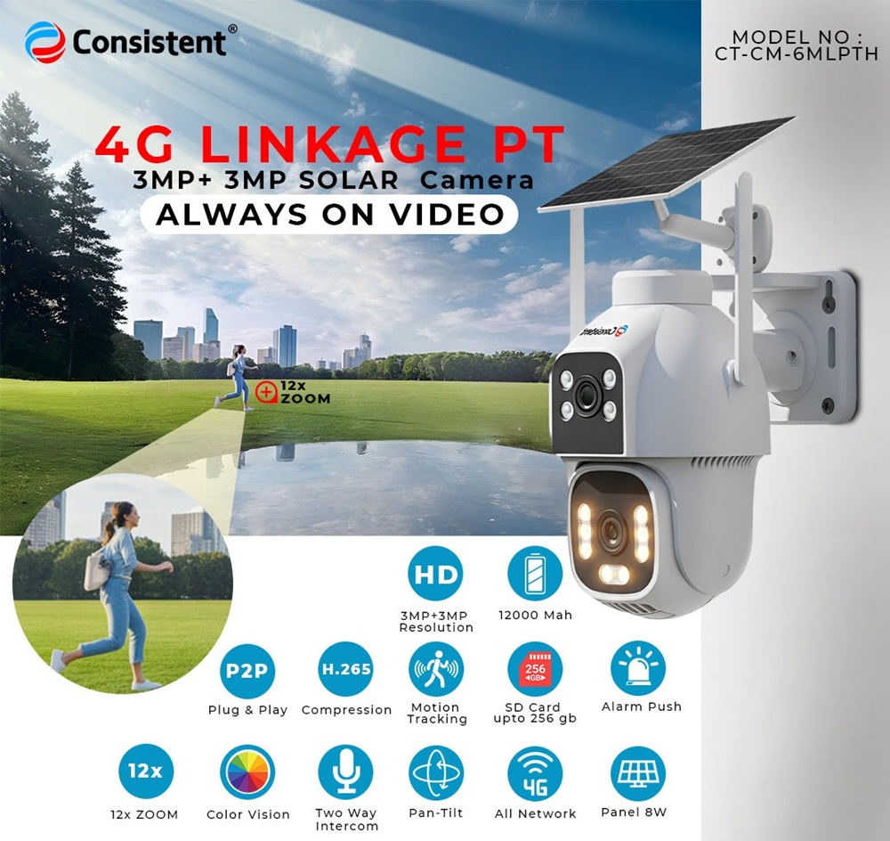 Consistent Infosystems has expanded its security product lineup with the 4G LINKAGE Pan Tilt 3MP+3MP Solar Camera, a dual-lens surveillance device. The camera features 3MP+3MP high-definition resolution with color vision and 12x zoom, providing clear visuals in both day and night conditions.