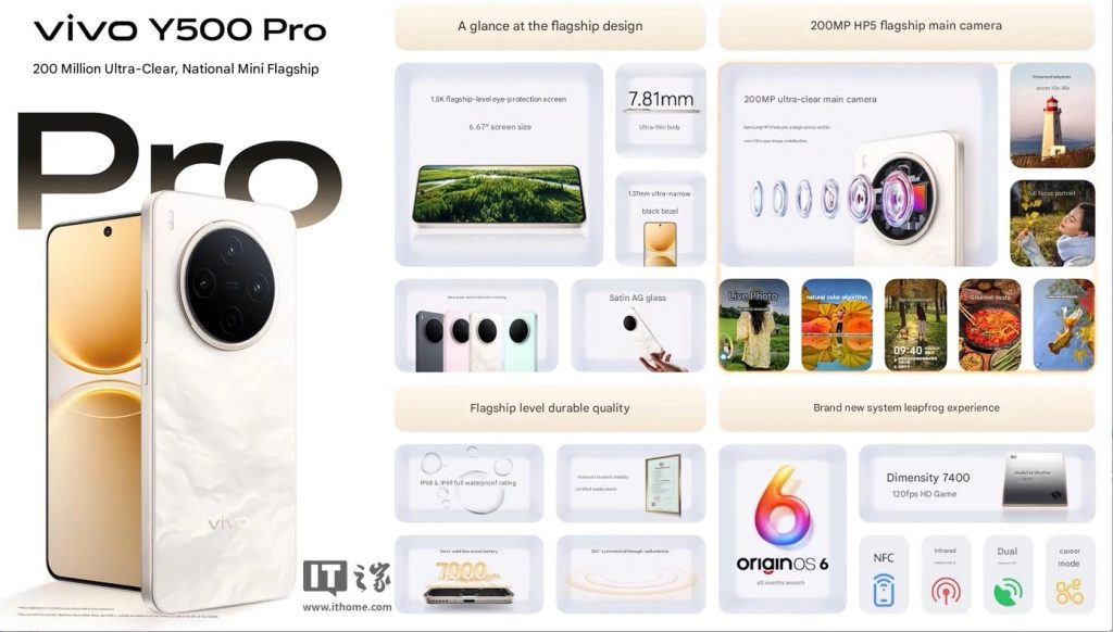 The vivo Y500 Pro mobile phone has IP68+IP69 dust and water resistance ratings, and it said that the phone will support IP68 even after 2000 minor drops, and has passed the national standard reliability certification. The main highlight of the phone is the huge, 7000mAh blue ocean battery with support for 90W flash charging.