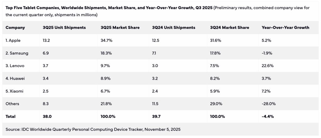 Worldwide tablet shipments declined 4.4% year-over-year in the third quarter of 2025 (3Q25), reaching 38 million units, according to the International Data Corporation (IDC) Worldwide Quarterly Personal Computing Device Tracker.