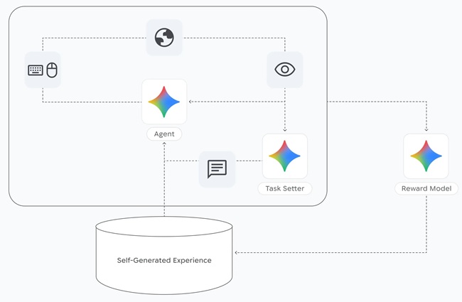SIMA 2 can improve independently through self-directed play. Initial training relies on human demonstrations, after which the agent can generate experience data to train future versions. This iterative process allows the agent to attempt increasingly complex tasks and learn in newly created environments without additional human data.