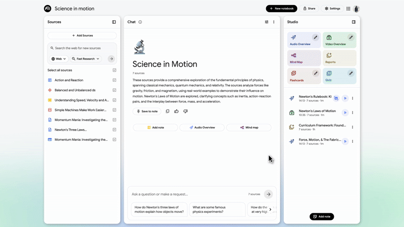 Deep Research creates a research plan, browses hundreds of sites, and refines its results based on ongoing analysis. The resulting report can be added directly to the notebook. Additional sources can be included while the agent continues running in the background, allowing users to build a comprehensive knowledge base.