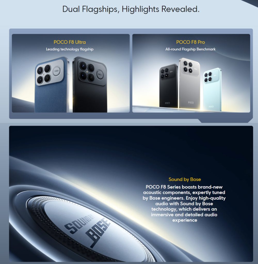 POCO has confirmed the launch of POCO F8 series smartphone for the global markets in an event in Indonesia on November 26th. The company will introduce the POCO F8 Pro and POCO F8 Ultra smartphones at the event as the successors to the F7 Pro and the F7 Ultra that were introduced earlier this year, and the image shows both the phones.