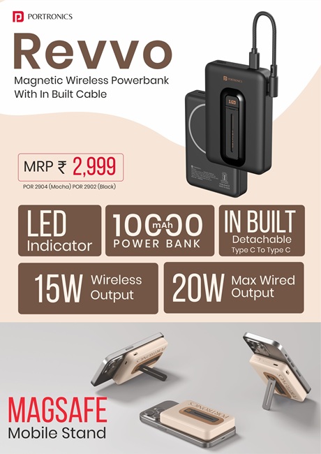 Portronics has introduced Revvo, a 10000mAh magnetic wireless power bank designed to enable cable-free charging on MagSafe-compatible phones.