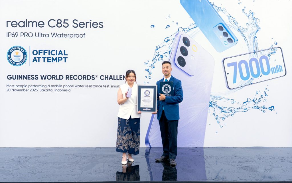 The realme C85 5G also marks a major milestone for the brand by achieving a Guinness World Records title for “Most people performing a mobile phone water resistance test,” highlighting the device’s durability, said the company.