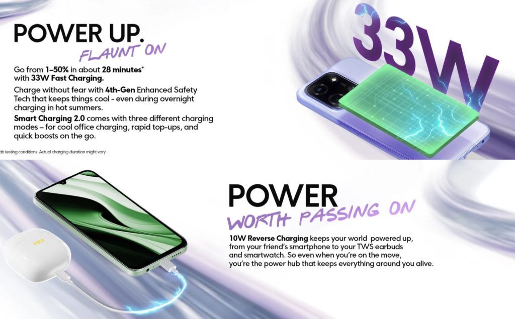 POCO has confirmed, 6000mAh battery for the phone with 33W fast charging that can charge the phone up to 50% in 28 minutes, and 10W reverse wired charging. The image shows green and violet colours for the phone.