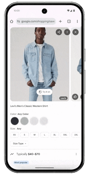 - Browse Apparel: While shopping on Google Search, tap the “try it on” icon on clothing product listings.