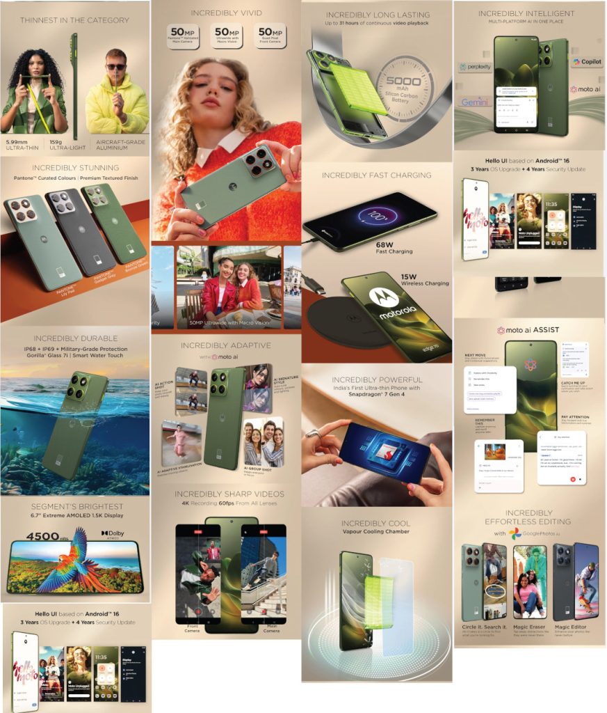 The motorola edge 70 will come in PANTONE Lily Pad, PANTONE Gadget Grey and PANTONE Bronze Green colours, feature metal frame, has IP68 + IP69 ratings for dust and water resistance and has military-grade durability. It will Android 16 out of the box and will get 3 Android OS updates and 4 years of security updates.