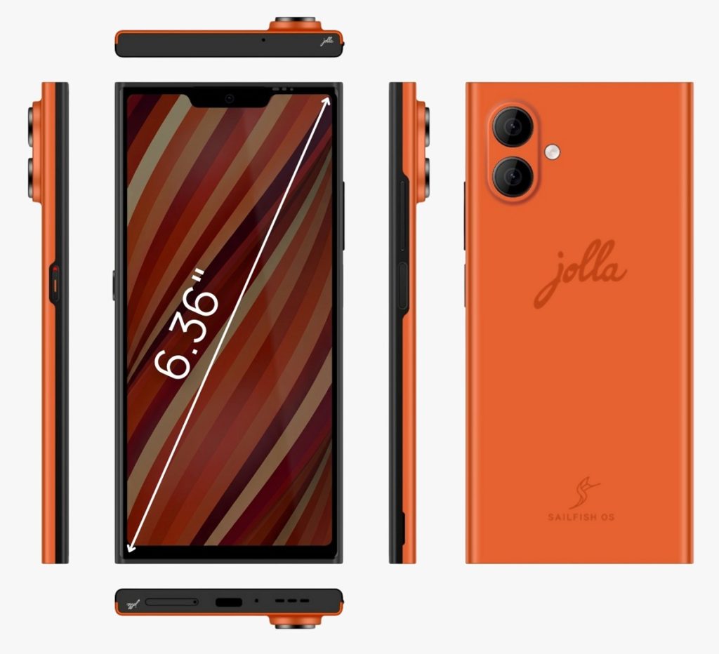 The device runs Sailfish OS 5 and supports Android apps through Jolla AppSupport, allowing users to disable Android components if needed. Connectivity options include 5G, dual nano-SIM support, WiFi 6, Bluetooth 5.4, and NFC. Additional hardware includes a side-mounted fingerprint scanner and an RGB notification LED.