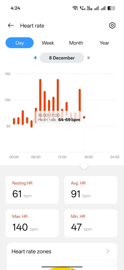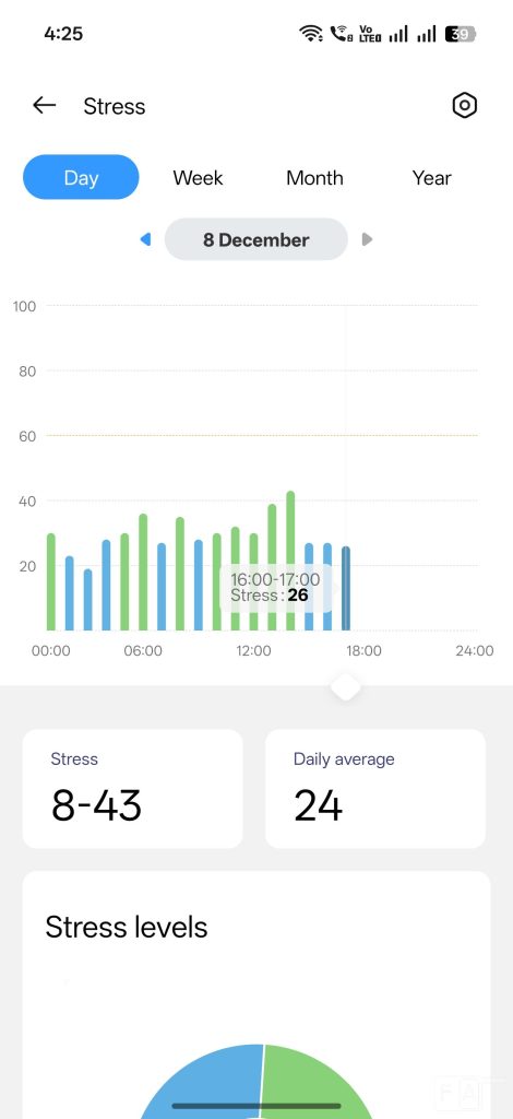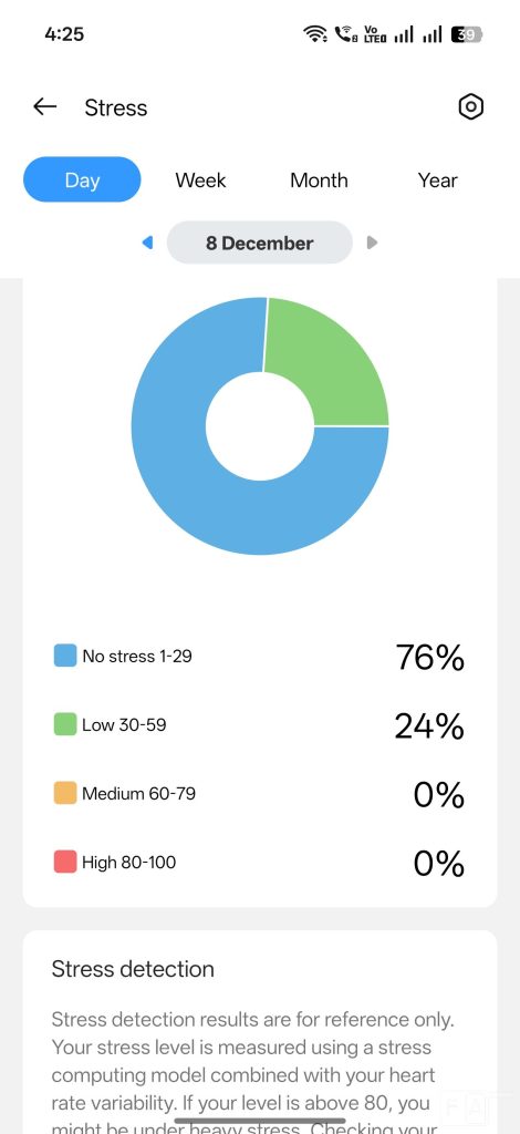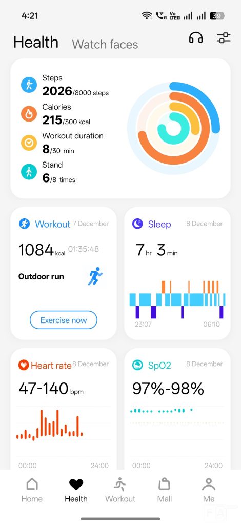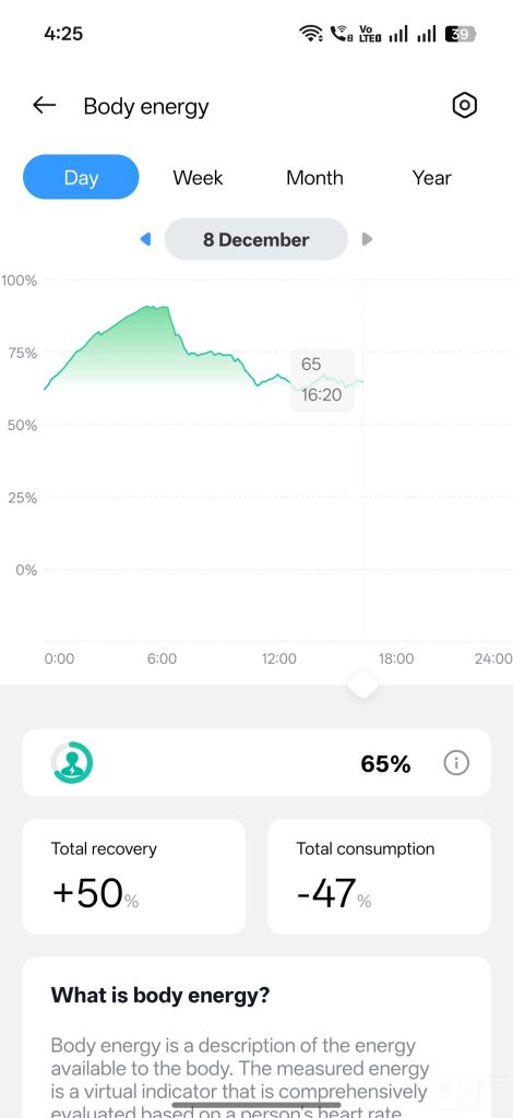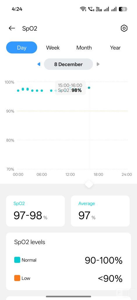 The smartwatch uses LED lights and photo-diodes to illuminate the blood vessel for a while and monitors the heart rate via the change of green light absorbed, and it uses red light for SpO2 or blood oxygen monitoring. You can’t say this is 100% accurate. Heart rate recordings — both resting and active, and SpO2 readings are decent compared to oximeter. It also shows stress data, and there is a new body energy feature that shows body battery.