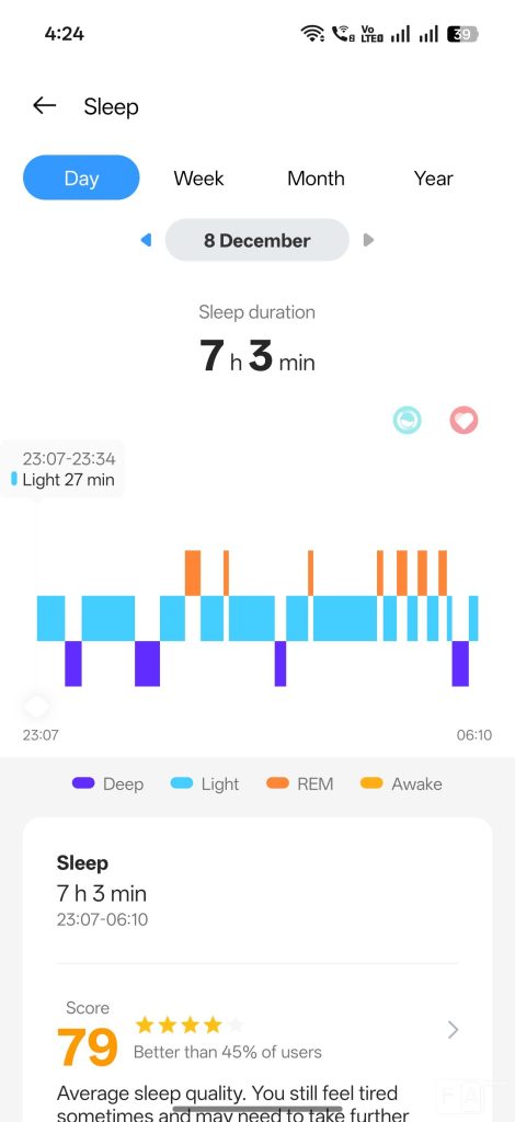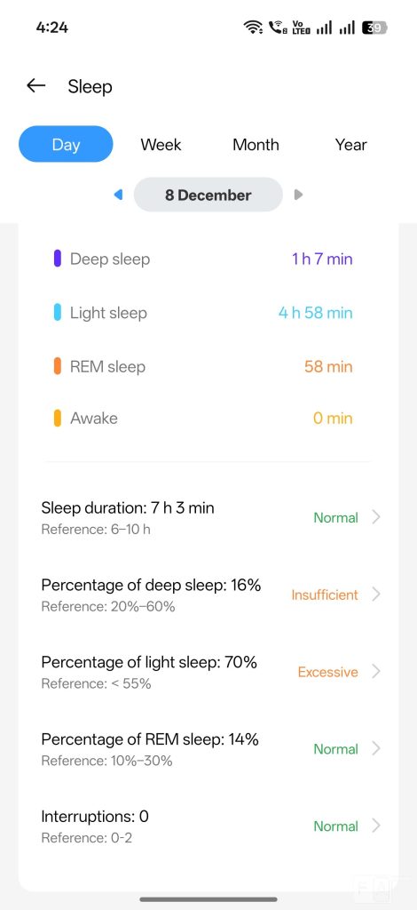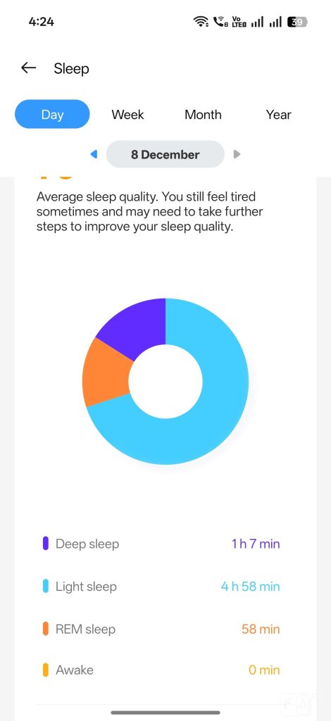 Sleep tracking shows light and deep sleep, awake time, as well as REM sleep. Tracking is good and accurate compared to realme Watch 3. It also shows the breathing quality, and can also track daytime naps.