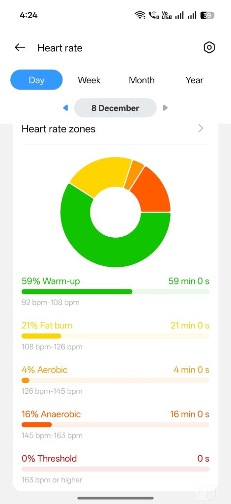 For outdoor activities, you get all the details such as distance, calories burnt, average heart rate, average speed, average pace, cadence and duration. You can also see VO2 Max, recovery period and heart rate zones for outdoor activities such as running.