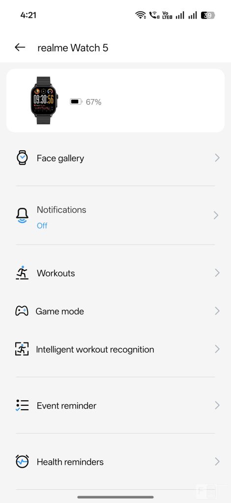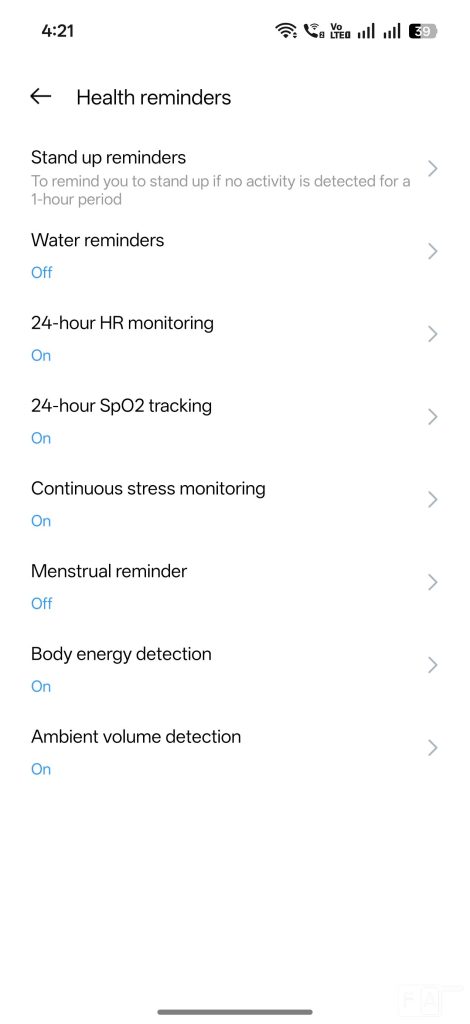 The realme Watch 5 still uses realme Link companion app to connect to Android and iPhone. It shows all the important details on the health tab. Inside the Watch 3 settings you can select call reminders, notifications from the preferred apps, health reminders such as 24-hour HR monitoring, stand up reminders, Water reminders and goal-reached reminder.