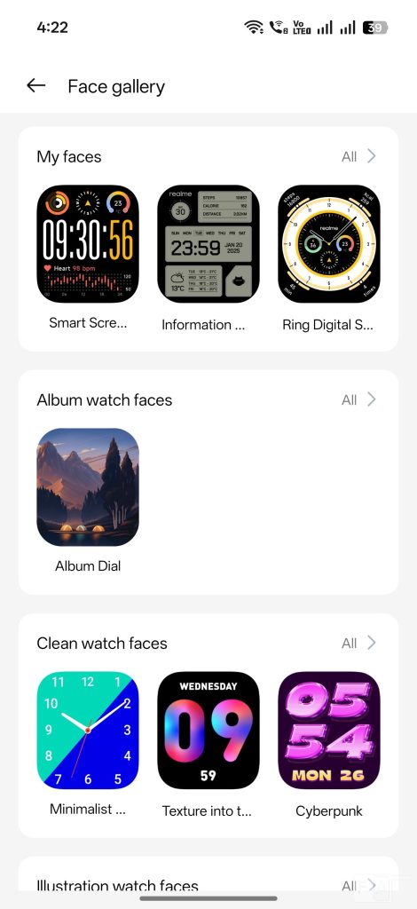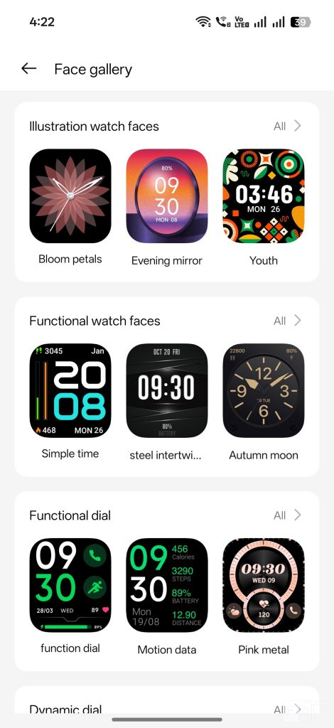 The face gallery shows different types of watch faces. There are over 300 customizable watch faces to choose from, but only a few options show a lot of data such as steps, heart rate, calories burnt, weather and other details.