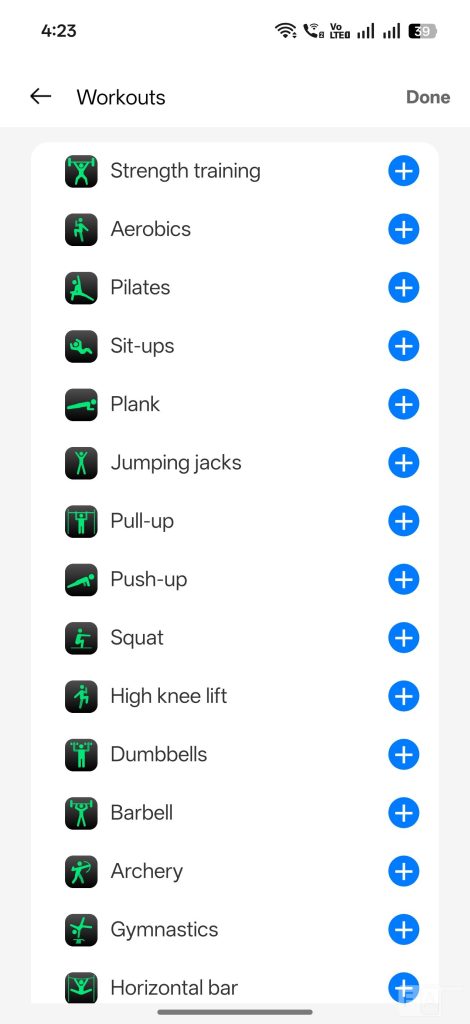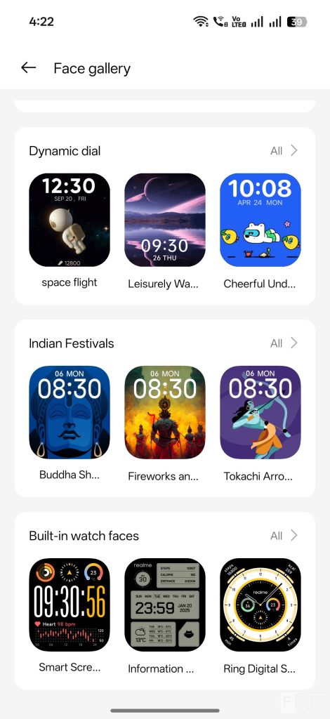 The realme Watch 5 has 108 workout modes with the main workouts being, Outdoor Walking, Indoor Walking, Outdoor Running, Indoor Running, Dynamic Cycling, Hiking, Cricket, Yoga, Rowing, Strength Training, Basketball, Elliptical Machine, Free training etc.