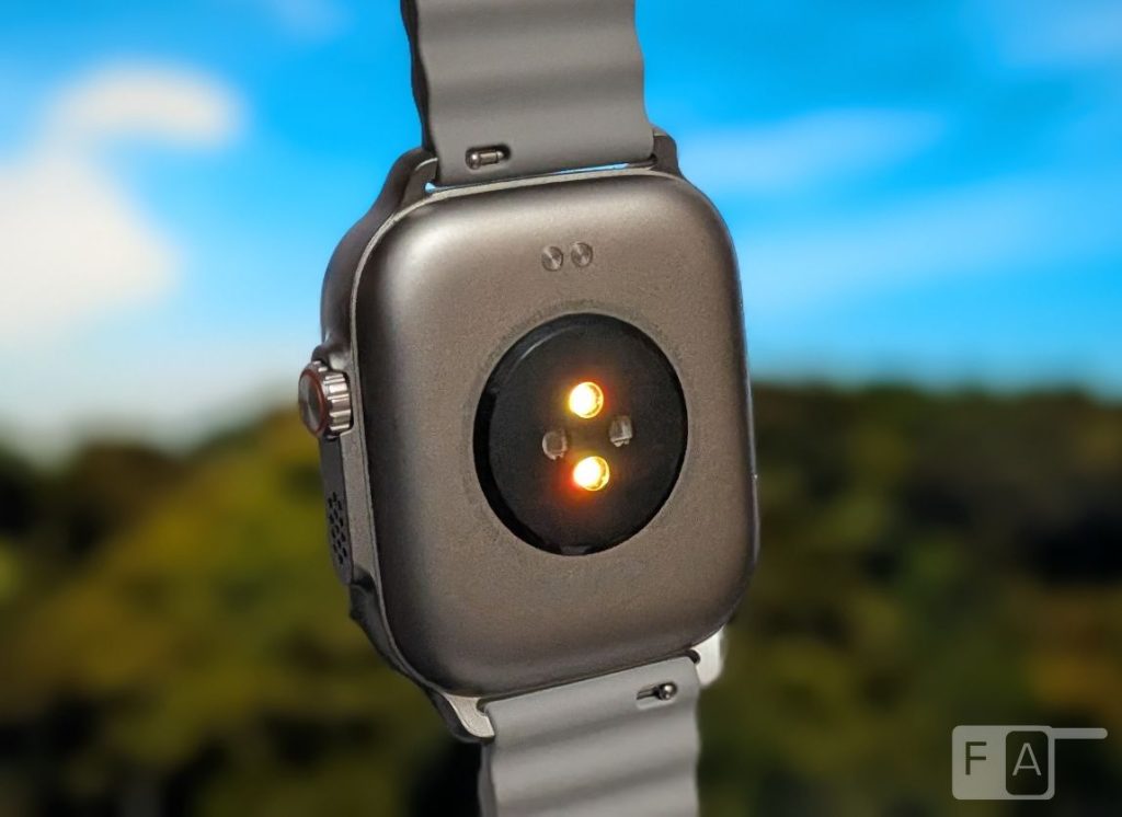 On the back, you can see the heart rate and SpO2 sensors that have glowing green and red LED lights when you are using it to measure heart rate and blood oxygen. There is a charging connector port above it. Even though the sides have a metallic frame, the back of the watch has a plastic finish.