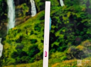 The power button on the right has a metallic finish and the essential button below it is in pink colour. The volume rockers on the left are in black.