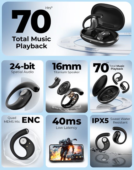 The device features 16mm titanium drivers that deliver balanced sound with rich bass and clear vocals for music, calls, and casual gaming. 24-bit spatial audio enhances the audio environment, while the open-ear design supports prolonged usage without discomfort.