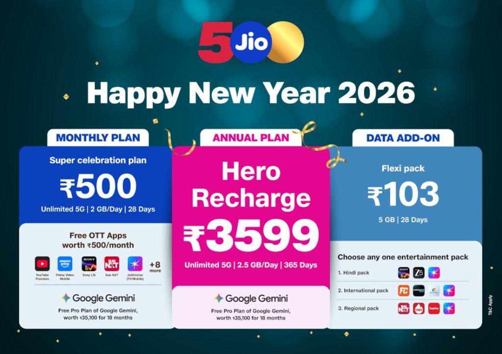 Reliance Jio has unveiled its new prepaid tariff portfolio titled the “Happy New Year 2026” plans. The update introduces three new recharge options ranging from data add-ons to annual subscriptions, with a focus on bundled OTT content and AI service integration.