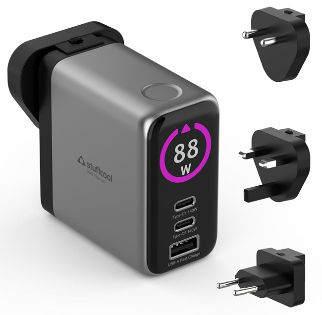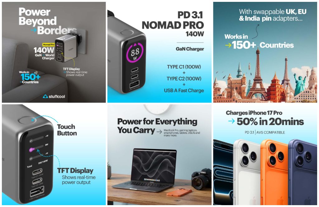 Stuffcool has launched the Nomad Pro, a GaN-based multi-port travel charger designed for international use, supporting simultaneous charging of up to three devices across more than 150 countries. The charger measures 9.37 × 7.05 × 3.6 cm and features a built-in US plug along with interchangeable EU, India, and UK plugs, eliminating the need for separate adapters.