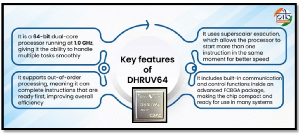 The Indian government has launched DHRUV64, India’s first homegrown 1.0 GHz, 64-bit dual-core microprocessor, strengthening indigenous capability in advanced processor development. It is a fully indigenous microprocessor developed by the Centre for Development of Advanced Computing (C-DAC) under the Microprocessor Development Programme (MDP).
