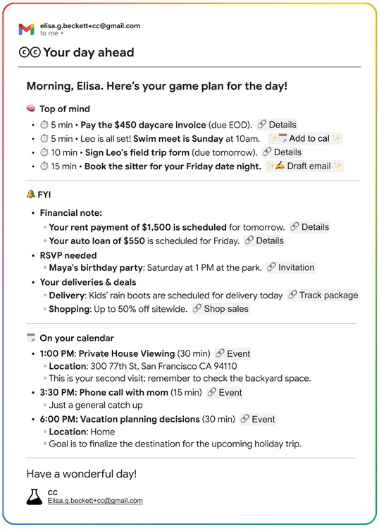 CC provides a customized “Your Day Ahead” email each morning, summarizing upcoming appointments, important tasks, and key updates. It can also prepare email drafts and generate calendar links to streamline actions. Users can email or reply to CC to request assistance, teach it preferences, or save ideas and tasks.