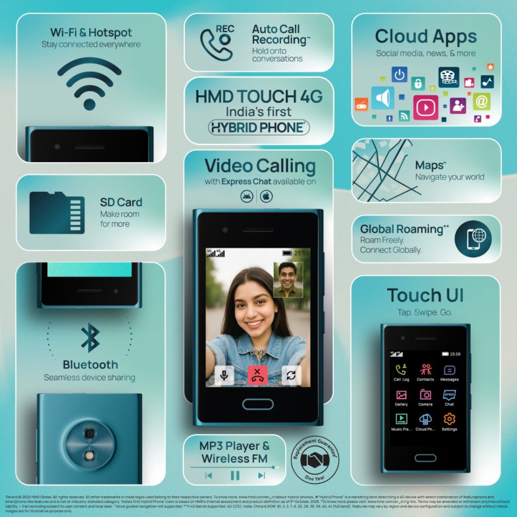 The HMD Touch 4G in Cyan and Dark Blue will be available at Rs. 3,999 starting 19th December, 6:00 PM through leading retail outlets, major e-commerce platforms, and exclusively via hmd.com.