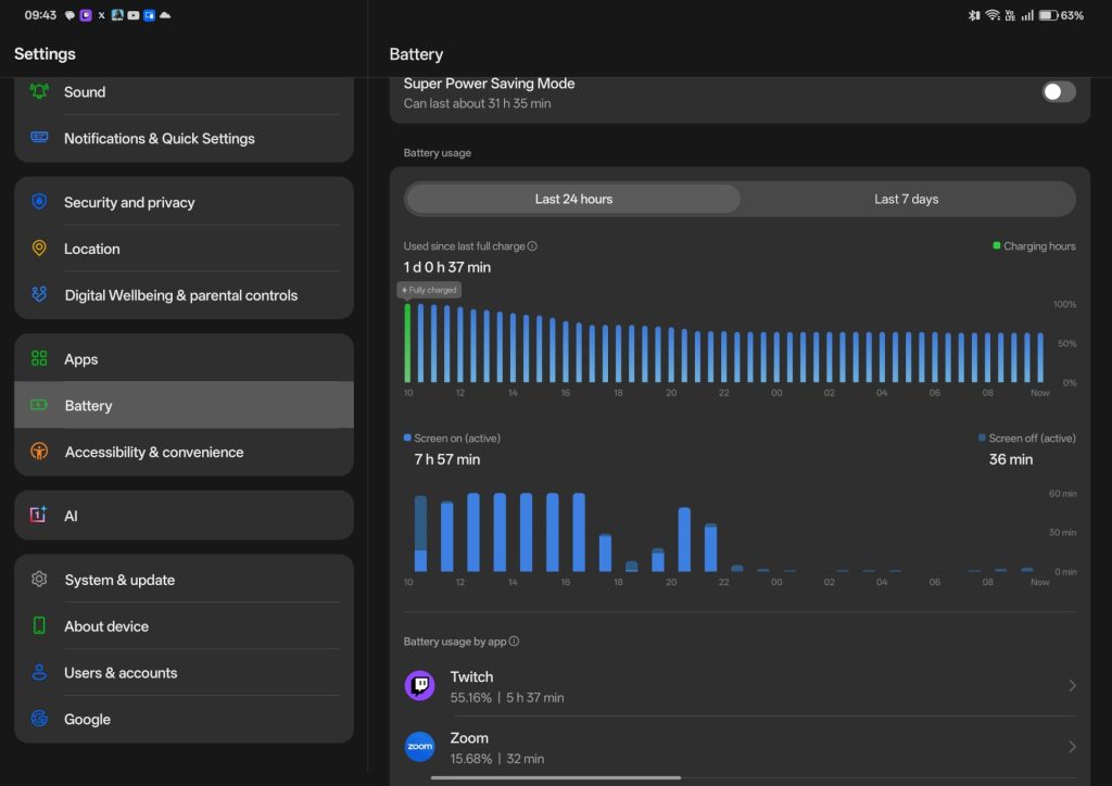 In the box you get a two-pin 45W SuperVOOC charger, however the tablet can only charge at a maximum rate of 33W. According to our testing, this gets the tablet from 0-100% in about 125 minutes, which is not the fastest, but good enough considering the size of the battery. Another useful-in-a-pinch feature is support for reverse wired charging at up to 6.5W, which is appreciated.