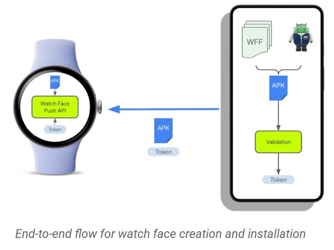 Users’ avatars are combined with a Watch Face Format template created in Watch Face Designer, exported as Watch Face Format (WFF) resources, and compiled into an APK using the Portable Asset Compiler Kit (Pack). The APK is validated using the Watch Face Push validator before being transmitted to the watch.