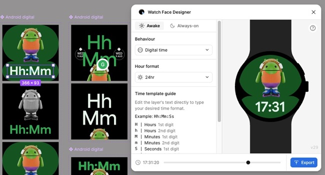 Watch Face Designer, a Figma plugin, is used to create templates that can be dynamically combined with avatars in Androidify. Developers can use this workflow to experiment with personalized watch faces or build their own marketplaces.