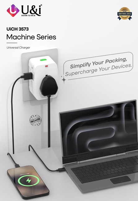 • UiCH 3573 Machine Series Travel Charger: Designed for international use across 200+ countries, with dual USB ports, foldable and retractable pins, and a power indicator light.