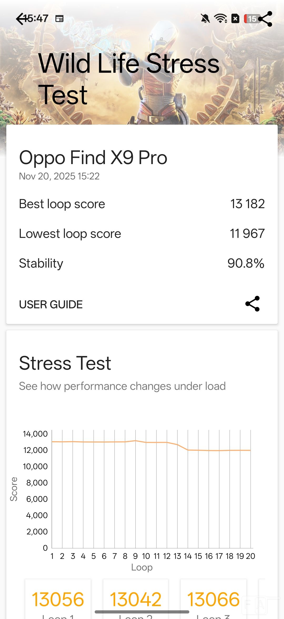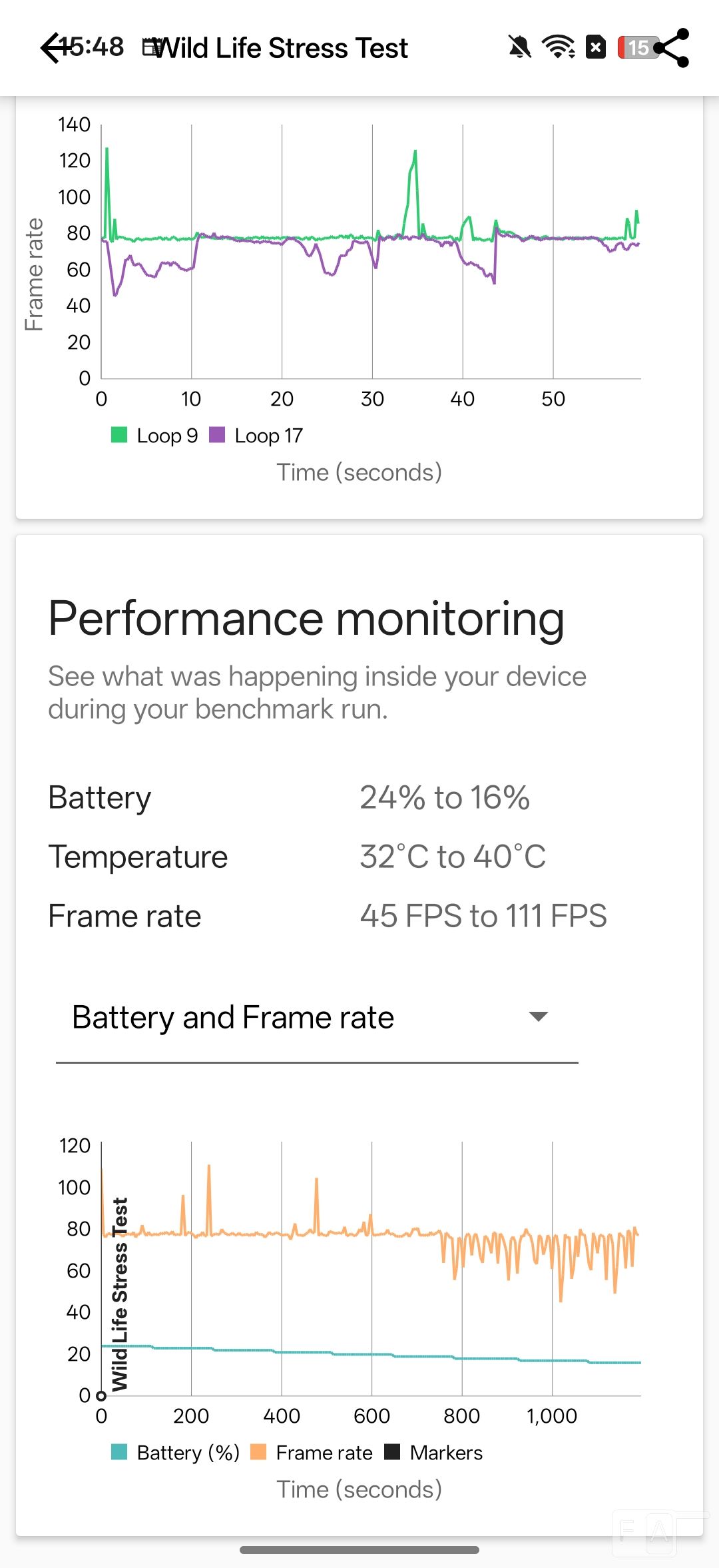 In 3D Mark wild life stress test, it scored 90.8%, which is way better the Find X8 Pro’s score of 57.3%, and the temperature shot up from 32 to 40 degrees. Even though the temperature increase is similar to the Find X8 Pro, there was not much of thermal throttling.