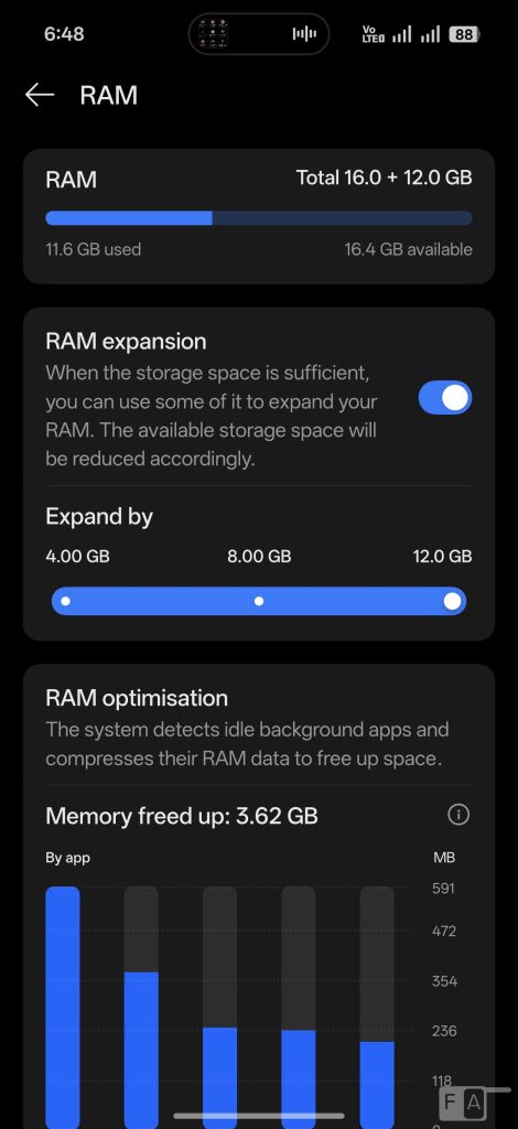 Out of 16GB LPDD5X RAM, you get 14.93GB of usable RAM, and about 8GB of RAM is free when default apps are running in the background. It also has DRE or dynamic RAM expansion feature, which uses the built-in storage as RAM. This has up to 12GB of additional RAM expansion. Out of 512GB UFS 4.1 storage, you get about 454.33GB of free storage. In addition to Google apps, it comes preloaded with few apps like Facebook, Snapchat, LinkedIn, and Spotify apps, but these can be uninstalled.