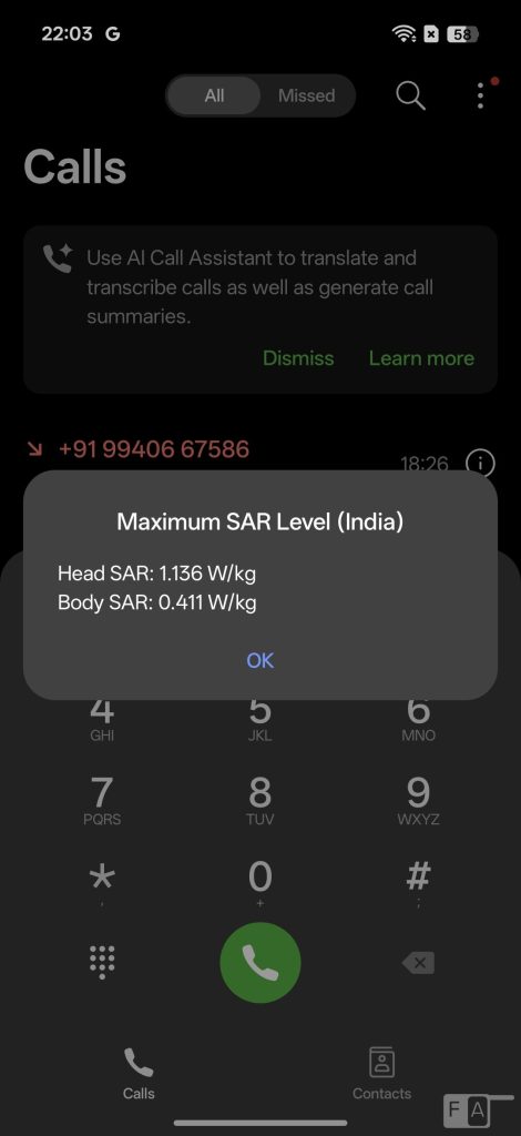 The Find X9 Pro’s body SAR is 0.411W/Kg and head SAR is at 1.1136/Kg that is well under the limit in India, which is 1.6 W/kg (over 1 g).