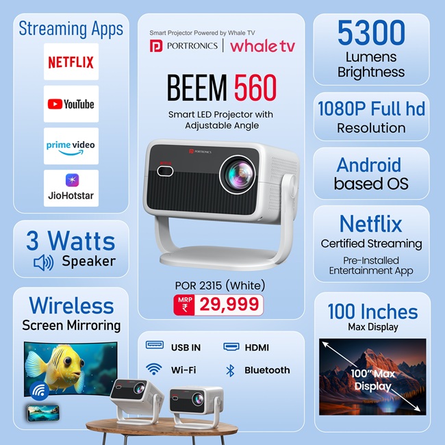Portronics has launched the Beem 560, a Smart LED Netflix certified projector. It features a 5300-lumen LED light source and supports 1080p Full-HD resolution (1920 × 1080). The projector can project images up to 100 inches. It includes autofocus and auto keystone correction, and an adjustable tilt-angle design for placement on tabletops, shelves, or bedside units.
