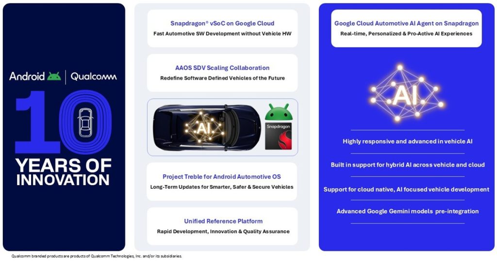 Qualcomm and Google announced an expansion of their decade-long collaboration in automotive technology. The partnership integrates Snapdragon Digital Chassis platforms with Google’s automotive software to support agentic AI features across next-generation vehicles.