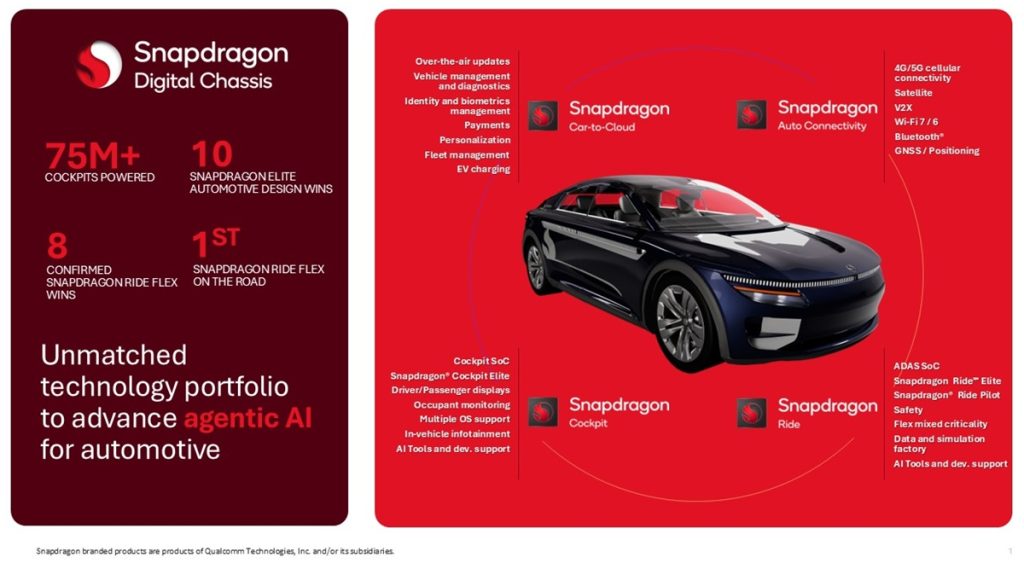 For automated driving, Qualcomm said it is advancing end-to-end AI algorithms through the Snapdragon Ride platform. The company is working with AD stack providers including DeepRoute.ai, Momenta, QCraft, WeRide, and ZYT, supporting multiple AI approaches and vehicle tiers. Qualcomm also reported nearly one million Snapdragon Ride system-on-chips shipped to date and confirmed new collaborations with ZF and Epec.