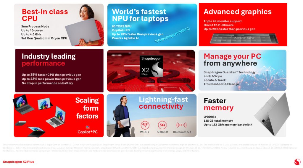 Regarding energy efficiency, the Snapdragon X2 Plus is designed to offer multi-day battery life. Intelligent power management distributes power to maintain consistent responsiveness, ensuring there is no drop in performance when the device is running on battery power.