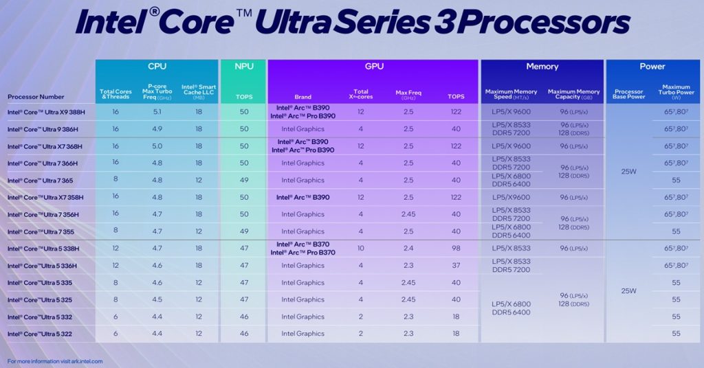 The Series 3 mobile lineup introduces a new class of Intel Core Ultra X9 and X7 processors with integrated Intel® Arc™ graphics, designed for multitasking, creation, gaming, and productivity. Key specifications include: