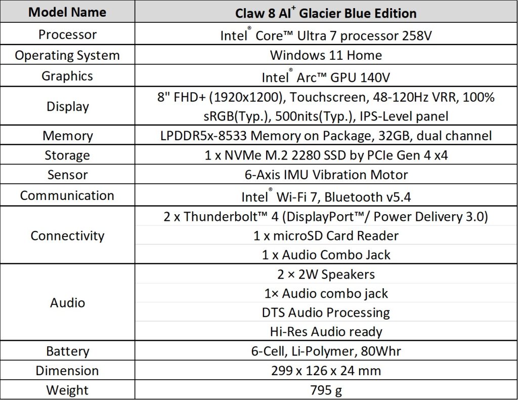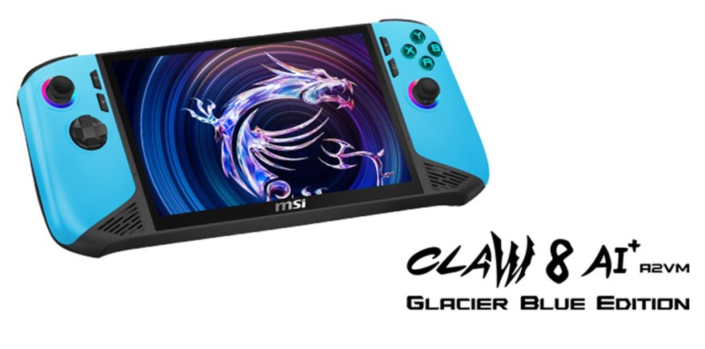 The Claw 8 AI+ Glacier Blue Edition has a Glacier Blue finish with layered icy tones. It retains the specifications of the original Claw 8 AI+, powered by Intel Core Ultra 200V processors and Arc Xe2 graphics.