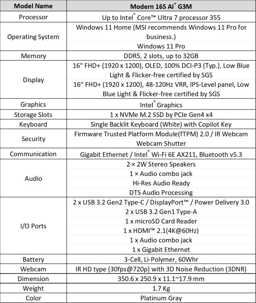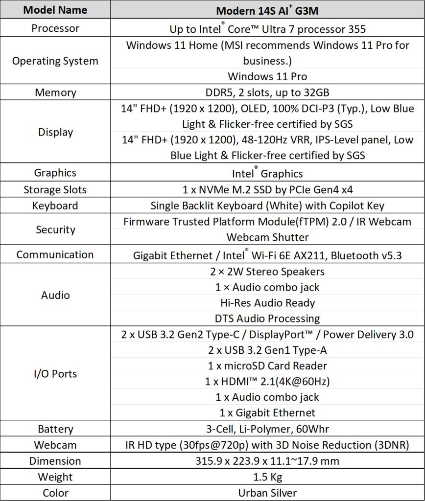 The Modern 14S and 16S feature a refreshed metal design with rounded contours. Both models are powered by Intel Core Ultra Series 3 processors and include dual memory slots. Connectivity options include USB-A, USB-C with display and charging support, HDMI, RJ-45 LAN, and a Micro SD card reader. Aluminum chassis designs measure as thin as 11.1mm, with weights starting at 1.3 kg.