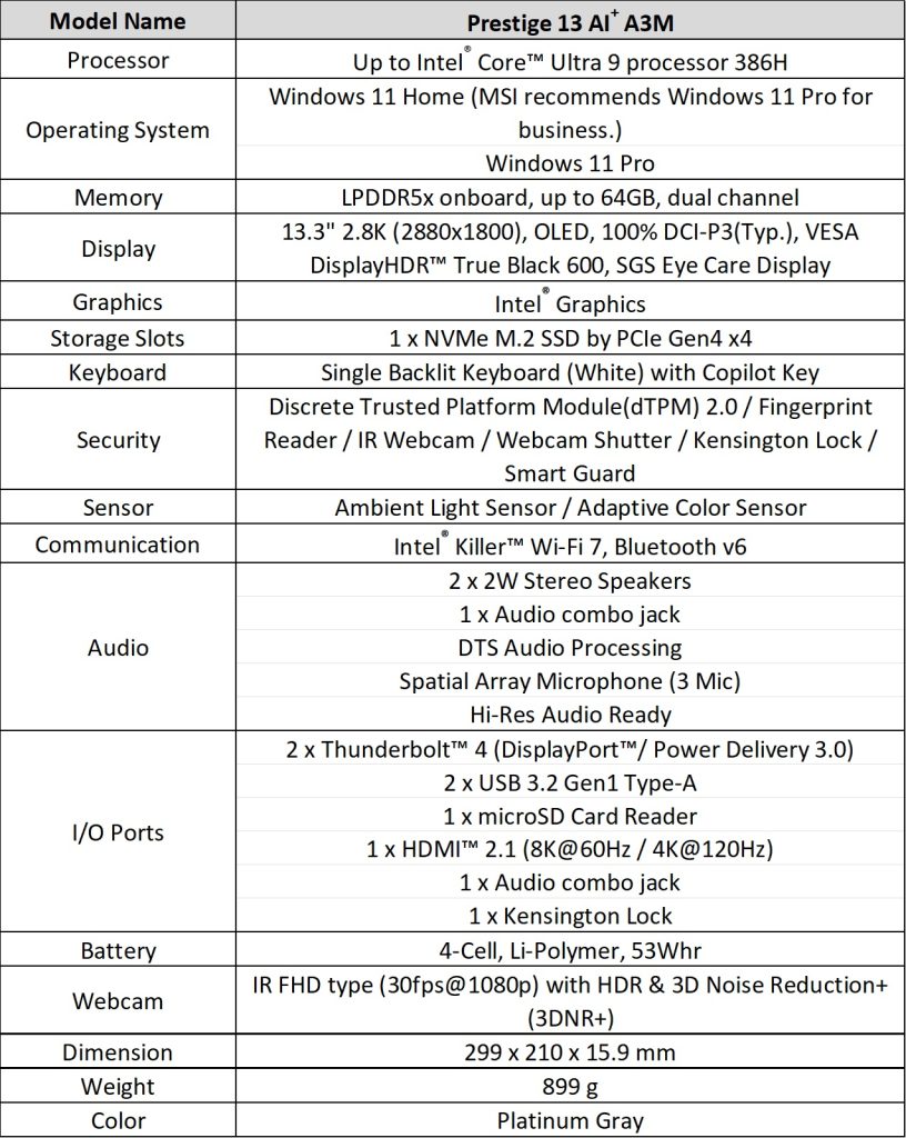 The Prestige 13 AI+ weighs 899 grams, making it the lightest 13-inch magnesium-aluminum laptop. It uses Intel Core Ultra Series 3 processors and provides professional-grade performance and security in a highly portable form factor.