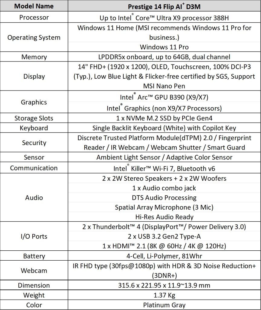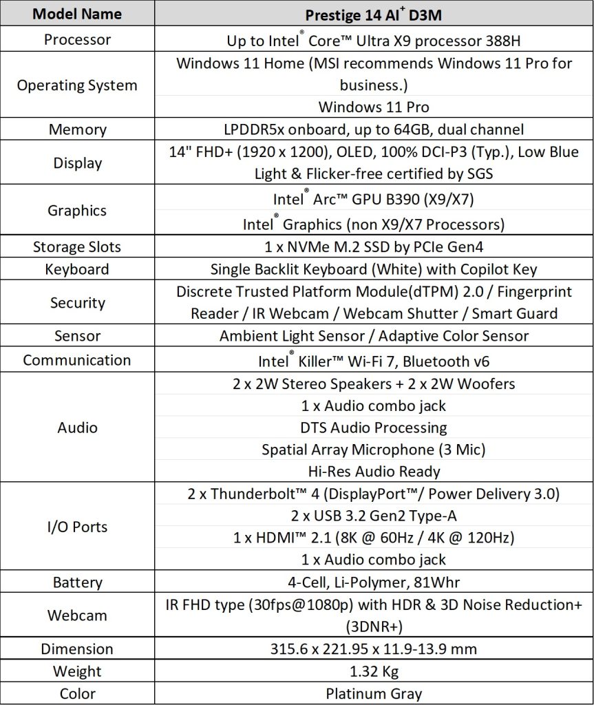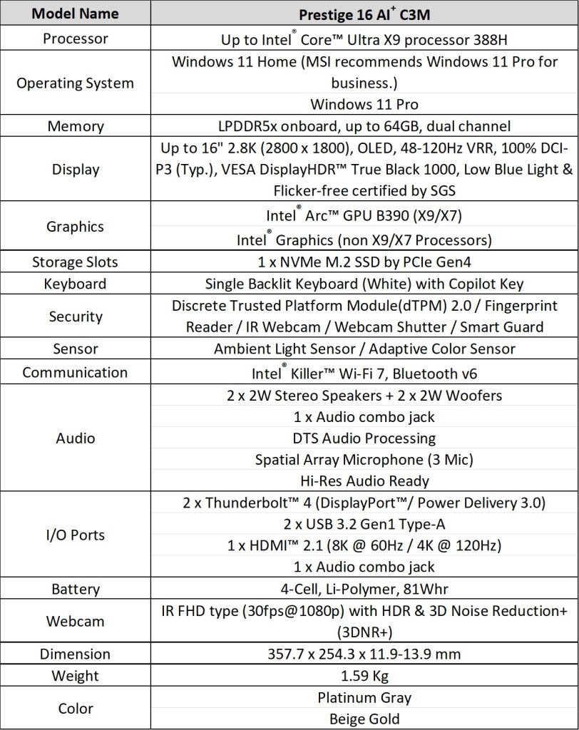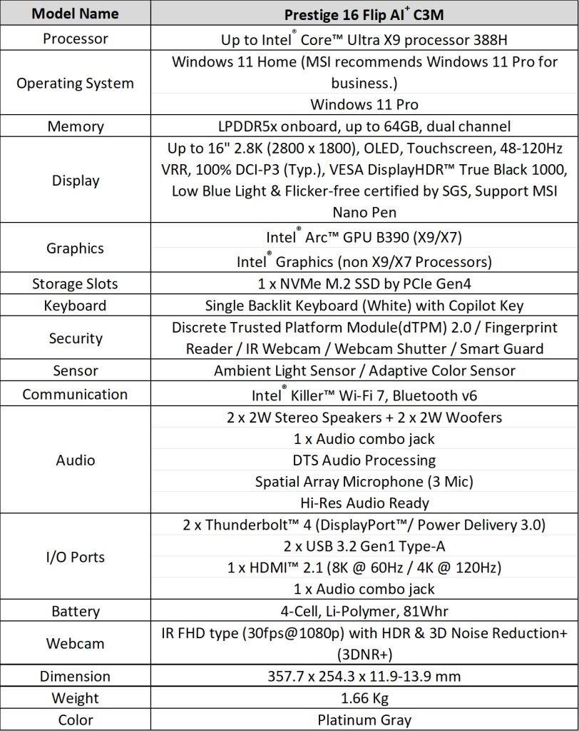 The new Prestige 14 and Prestige 16 feature a thinner, rounded aluminum design. The Prestige 14 weighs 1.32 kg, a 22% reduction from the previous generation, while the Prestige 16 weighs 1.59 kg. Both models are powered by Intel Core Ultra Series 3 processors, Intel Arc B390 graphics, and a high-capacity 81Wh battery that supports up to 30+ hours of 1080p video playback. Cooling is handled via a vapor chamber, dual-fan, and Intra Flow thermal system keeping noise levels under 30 dBA.