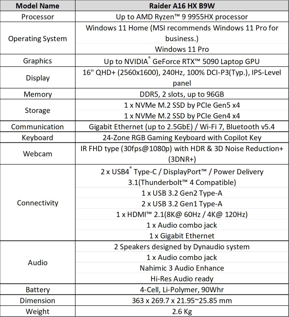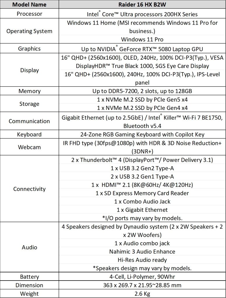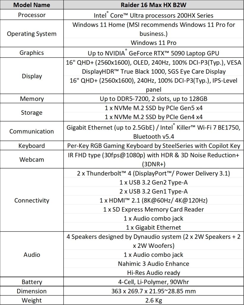 The Raider 16 Max HX delivers 300W total system power: 175W to NVIDIA RTX 5090/5080 graphics and 125W to Intel Core Ultra 200HX processors. Cooling is provided by Cooler Boost Trinity with Intra Flow thermal design, featuring three fans, six heat pipes, five exhaust vents, and phase-change thermal compound.