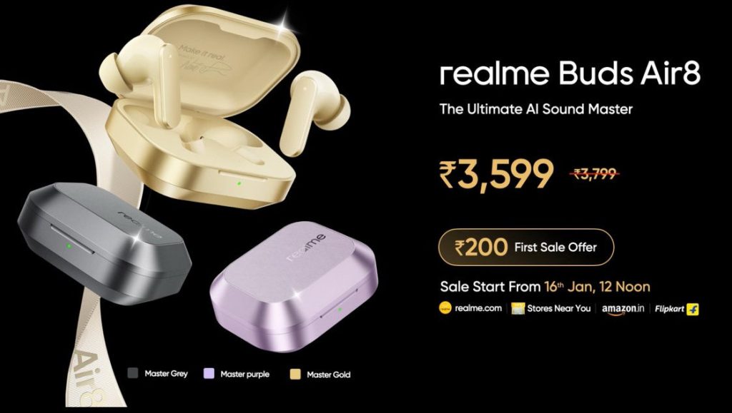 The realme Buds Air8 comes in Master Gold, Master Grey and Master Purple colours and is priced at Rs. 3,799, but it will be available at Rs. 3599 when it goes on sale on the first time on January 16th on realme.com, Flipkart, Amazon.in and offline stores.